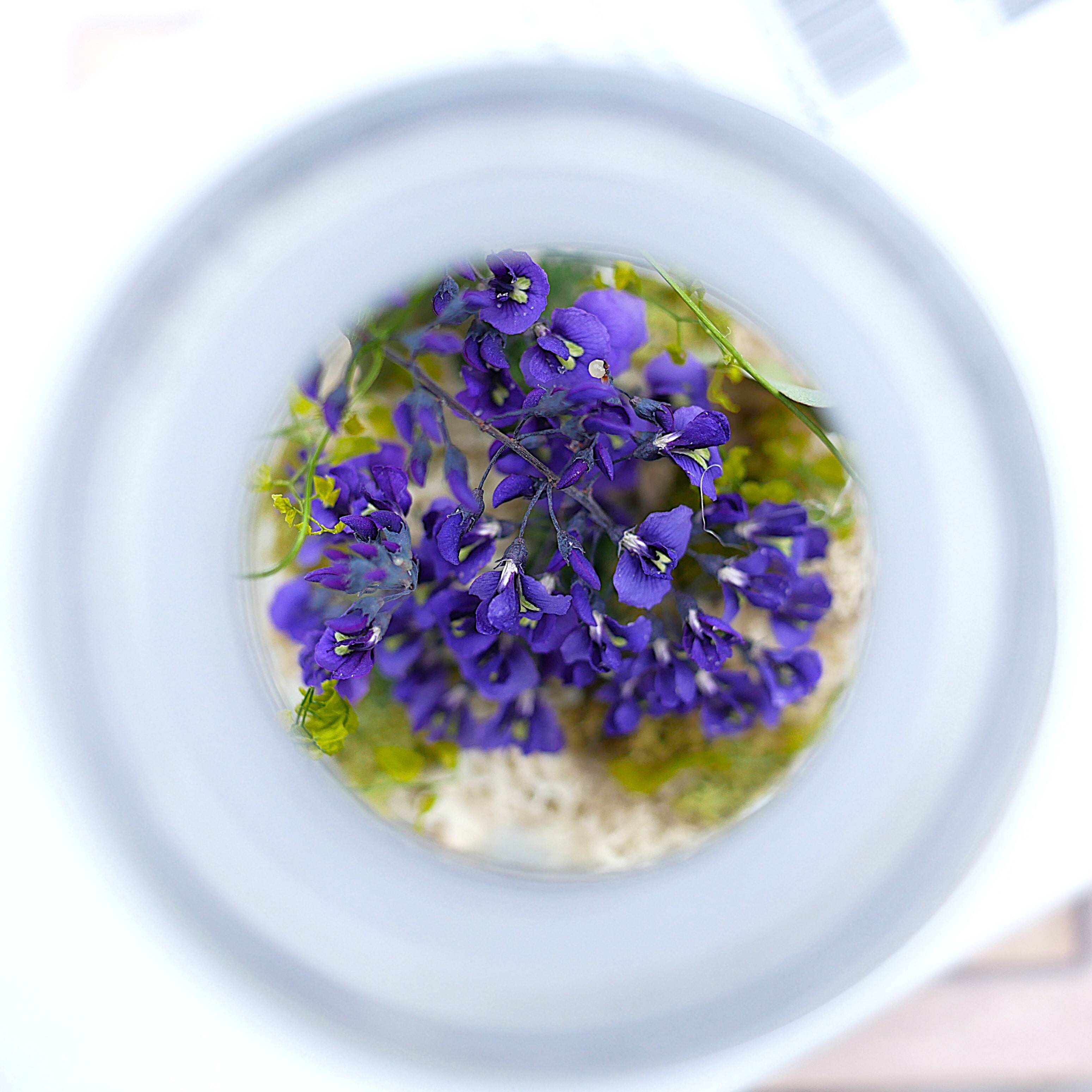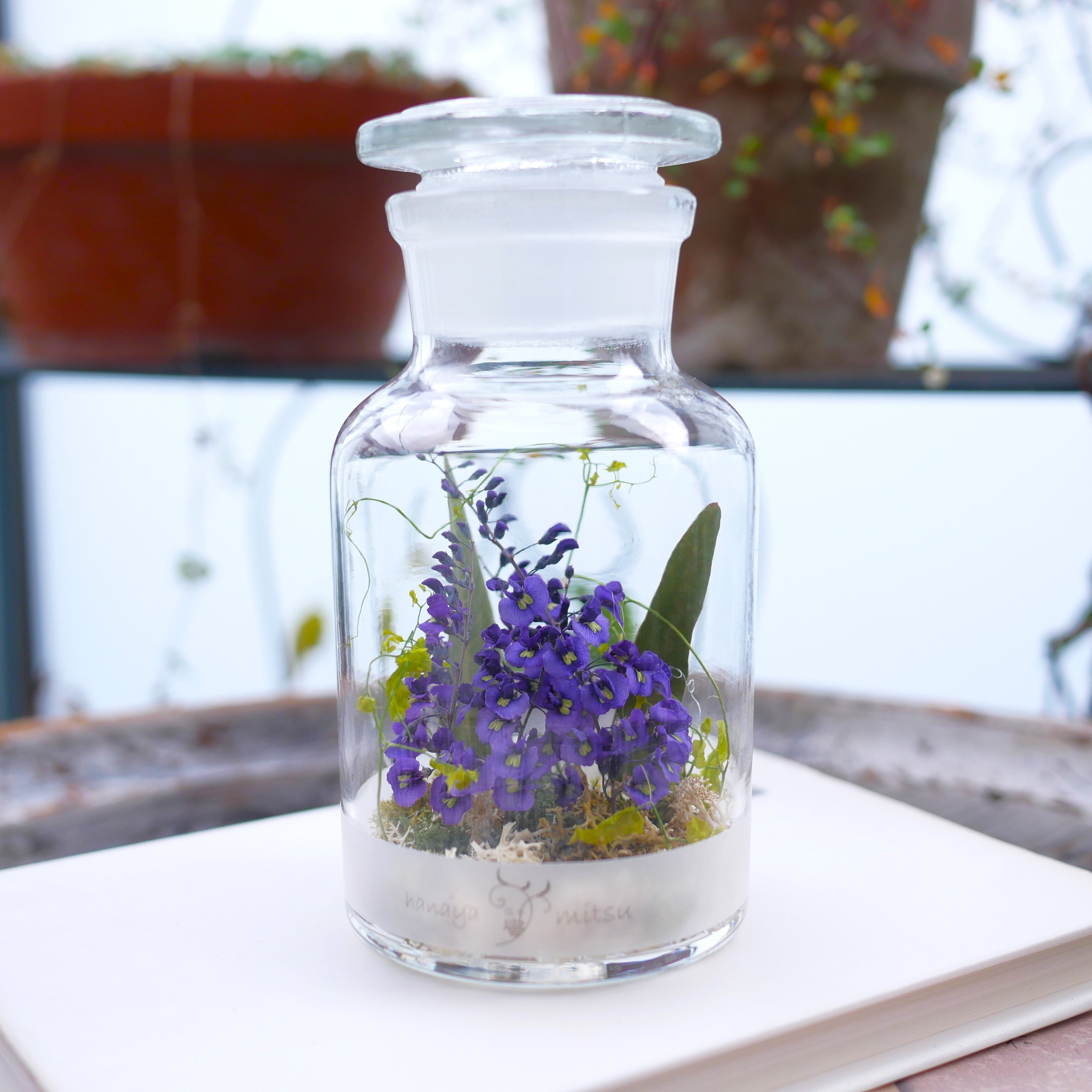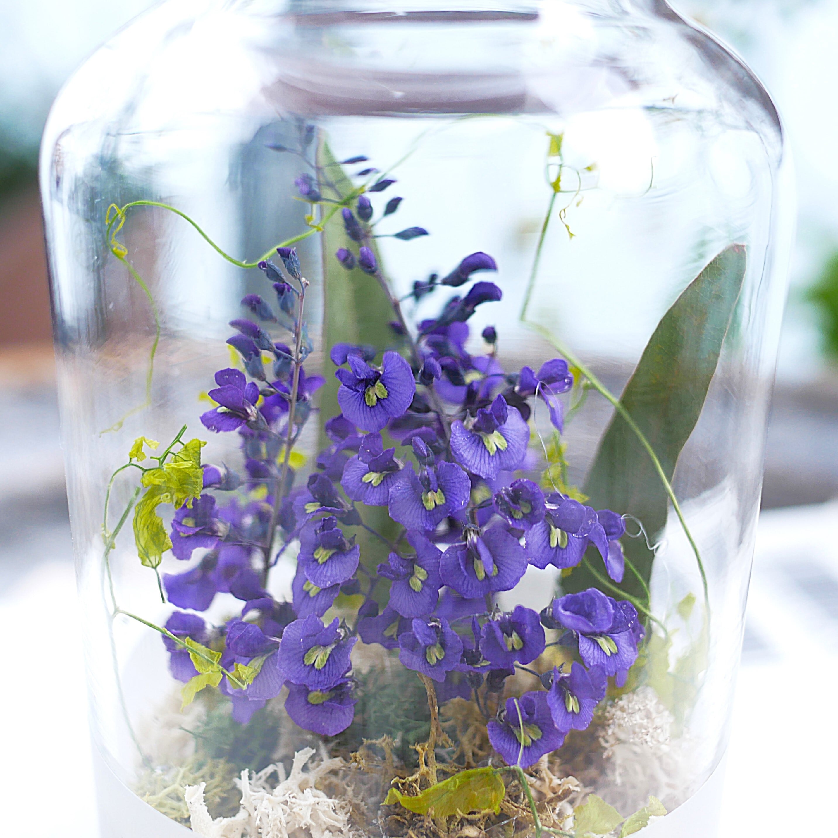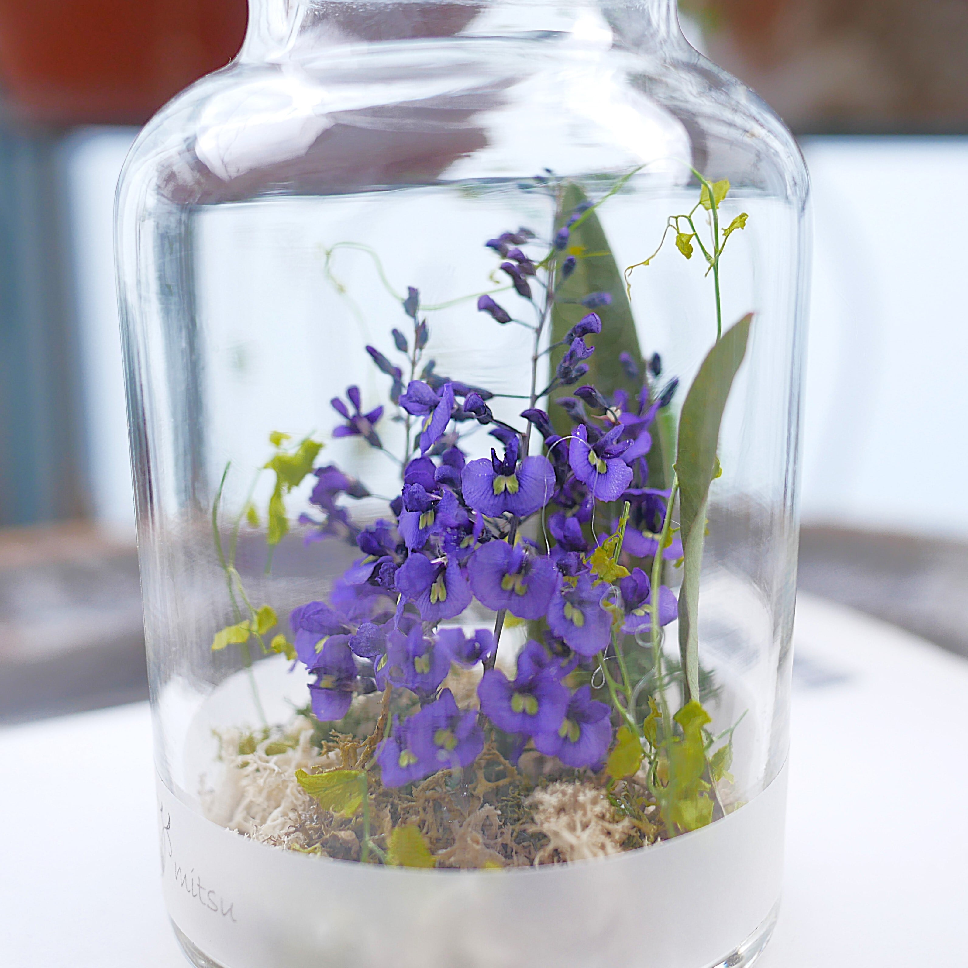 ハーデンベルギアを自宅でドライフラワーにして、咲いている姿そのままにガラス瓶に閉じ込めた植物標本。